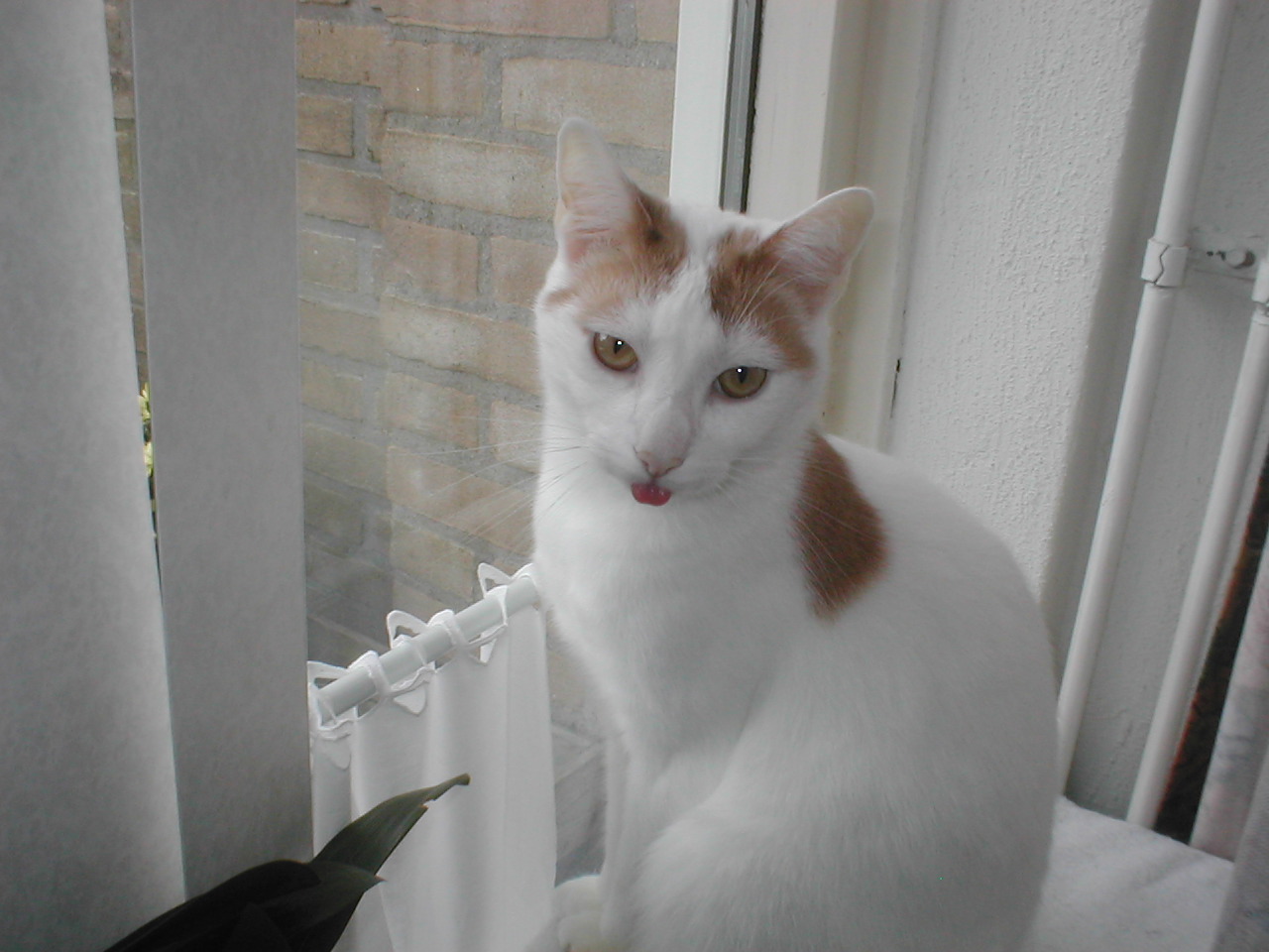 Voor die tijd zwierf hij buiten op straat, bij mij voor de deur. Hij was graatmager en van kop tot en met staart kaal. Het was winter en het vroor bijna 10° C – overdag. Hij kreeg het voer dat mijn andere katten hadden laten staan en ook brokjes en kwam daarom steeds terug. Dan riep ik: “honger?” en dan kwam hij er weer aan.